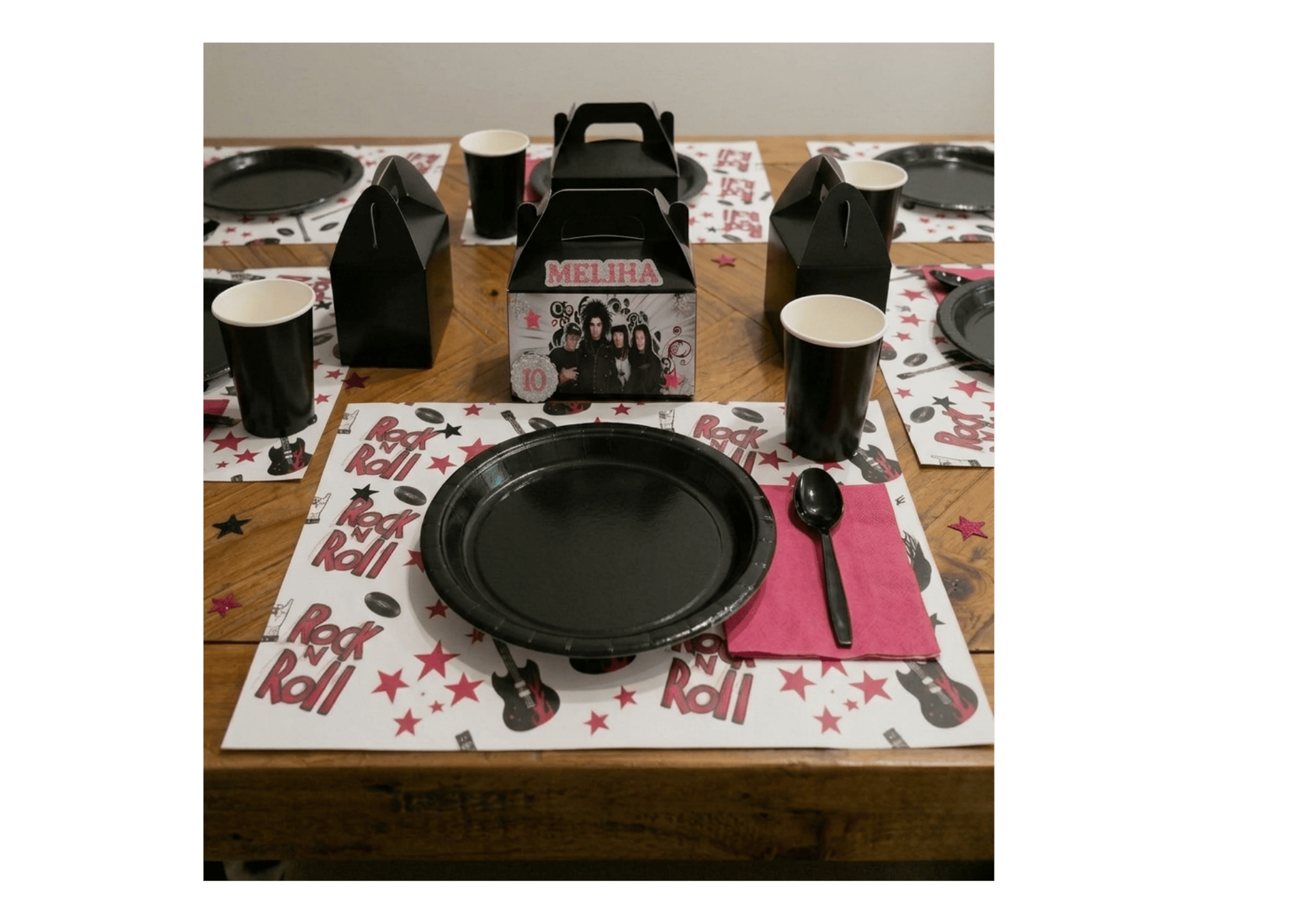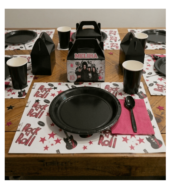 Party Tableware: Personalized placemats, plates, cups, and napkins.